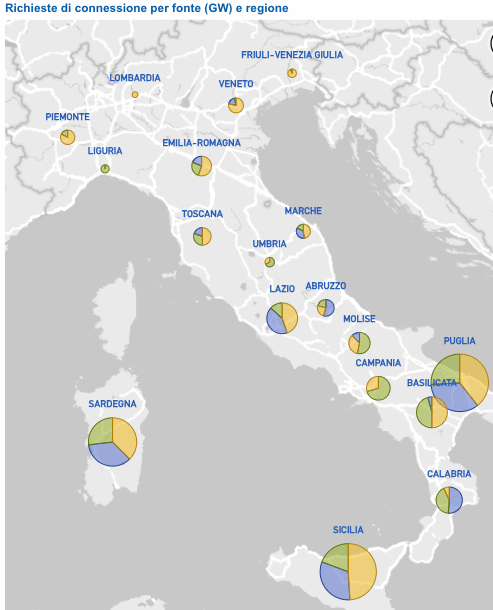 Rispetto alla potenza complessiva delle pratiche nel processo di connessione (317.77 GW), questa è la situazione per regione: