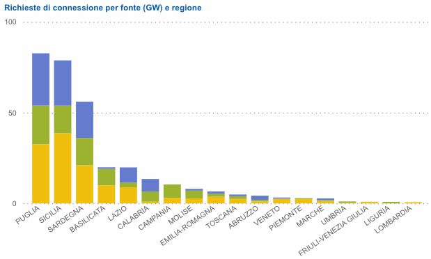 Puglia 82.75 GW; Sicilia 78.84; Sardegna 56.08; Basilicata 19.92; Lazio 19.85; Calabria 13.45; Campania 10.49; Molise 8.02; Emilia-Romagna 6.61; Toscana 4.91; Abruzzo 4.33; Veneto 3.25; Piemonte 2.95; Marche 2.77; Umbria 1.1; Friuli V.G. 093; Liguria 0.86; Lombardia 0.7.