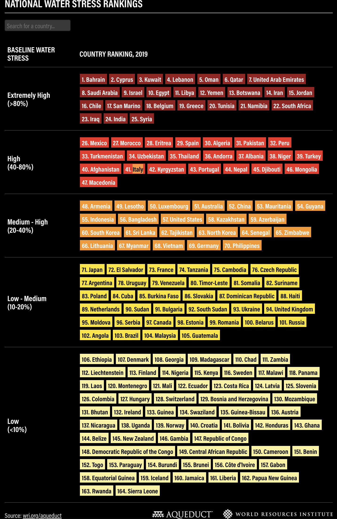 I cinque paesi più stressati dall’acqua sono Bahrein, Cipro, Kuwait, Libano, Oman e Qatar. Lo stress idrico in questi paesi è principalmente causato dalla scarsa offerta, abbinata alla domanda per uso domestico, agricolo e industriale. Le regioni più stressate dall’acqua sono il Medio Oriente e il Nord Africa, dove l’83% della popolazione è esposta a uno stress idrico estremamente elevato, e l’Asia meridionale, dove è esposto il 74%.