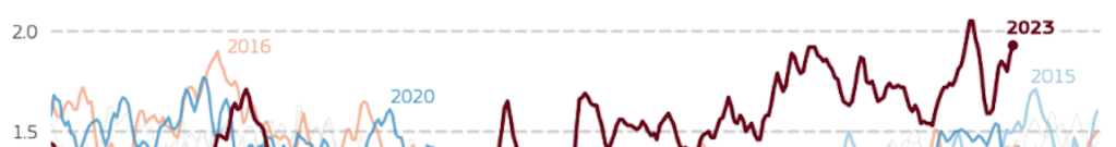 Ed è impressionante osservare come quella fascia compresa tra 1.5 e 2 gradi Celsisus, che ormai da almeno 8 anni sappiamo non andrebbe superata come aumento di temperatura media globale, a partire proprio dalla fine del 2015 è iniziata ad essere frequentata dai grafici. Soprattutto, preoccupante. E osservando quella fascia si vede bene come gran parte del 2023 si trovi esattamente dove non dovremmo essere e non dovremmo arrivare. Dove la scienza mondiale del clima ci sta dicendo da tanto tempo che il Pianeta, l’Umanità e tutte le specie, non dovrebbero arrivare come temperature medie globali.