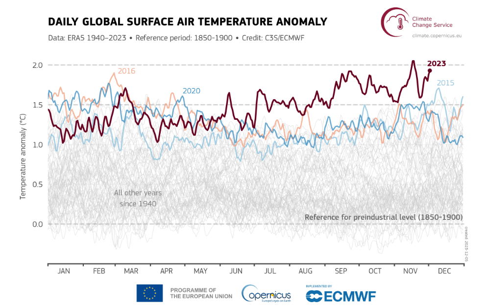 Per l’anno solare fino ad oggi, da gennaio a novembre, la temperatura media globale per il 2023 è la più alta mai registrata, 1.46°C superiore alla media preindustriale del periodo 1850-1900 e 0.13°C superiore alla media degli undici mesi del 2016, attualmente l’anno solare più caldo mai registrato.