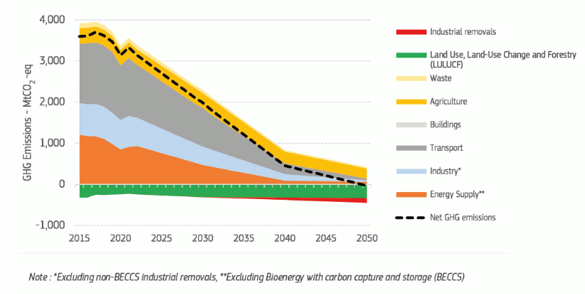 Il raggiungimento dell’obiettivo raccomandato del 90% richiederà sia la riduzione delle emissioni che l’eliminazione del carbonio. Occorrerà utilizzare le tecnologie di cattura e stoccaggio del carbonio e l’uso del carbonio catturato nell’industria. La strategia di gestione industriale del carbonio dell’UE sosterrà lo sviluppo di catene di approvvigionamento di CO2 e delle necessarie infrastrutture di trasporto di CO2. La cattura del carbonio dovrebbe essere mirata ai settori hard-to-abate (difficili da abbattere), dove le alternative sono economicamente meno valide. L’assorbimento del carbonio sarà necessario anche per generare emissioni negative dopo il 2050.