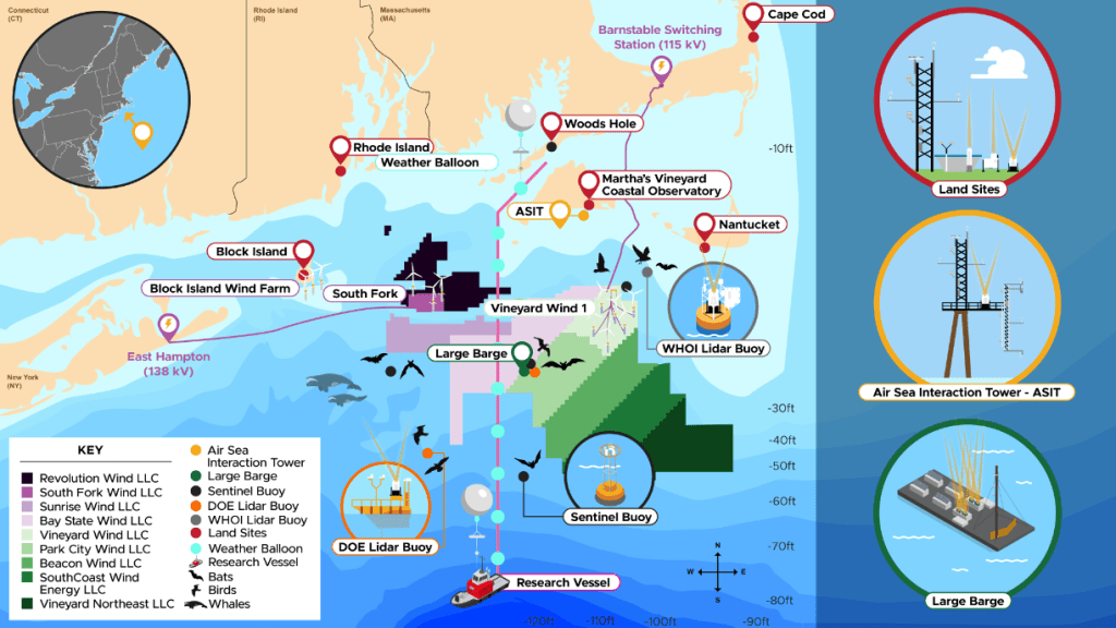 Il progetto sta distribuendo strumenti in sei siti terrestri, con strumentazione Argonne a Martha’s Vineyard, Cape Cod, Nantucket Island e Rhode Island. Una chiatta, dotata di strumentazione, sarà presto ormeggiata nelle acque dove verranno installate le turbine eoliche offshore. La strumentazione fornirà osservazioni metoceaniche dettagliate dalla superficie fino alla sommità dello strato limite. Queste osservazioni saranno cruciali per perfezionare e convalidare i modelli di previsione, migliorando in definitiva la comprensione delle risorse di energia eolica offshore.