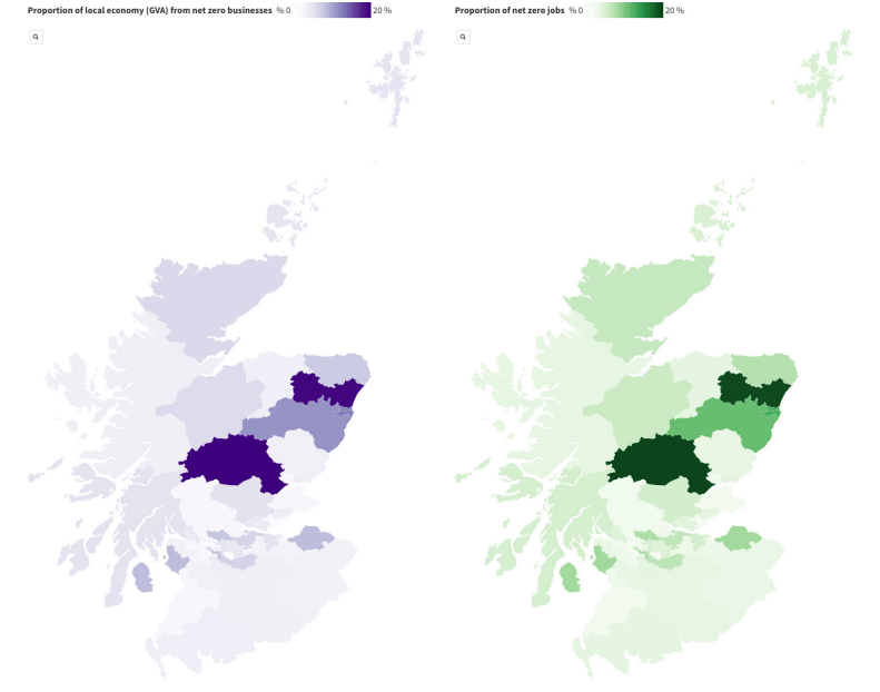 Anche molte economie locali scozzesi hanno una percentuale significativa attribuita all’economia a zero emissioni. Aberdeen era una roccaforte per l’attività economica a zero emissioni, con net zero economy sia ad Aberdeen Sud che ad Aberdeen Nord che contribuivano per oltre il 10% all’occupazione locale (11,8% e 10,5% rispettivamente).