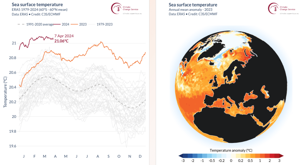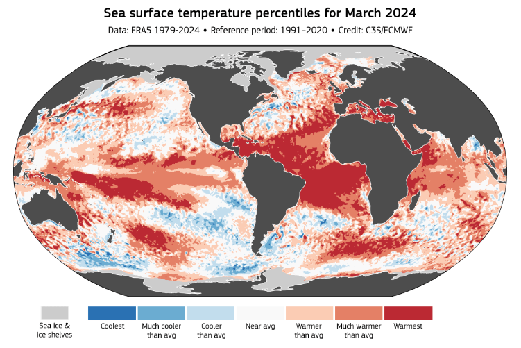 Le elevate temperature dell’aria marina sono state associate a temperature record della superficie del mare (SST). La SST giornaliera in media nella fascia di latitudini 60°S–60°N è continuata nel marzo 2024 a pochi centesimi di grado al di sotto del nuovo massimo assoluto di 21,09°C raggiunto alla fine di febbraio. La sua media di marzo, 21,07°C, è diventata il valore mensile più alto mai registrato, superando leggermente il precedente massimo mensile di 21,06°C registrato per febbraio.