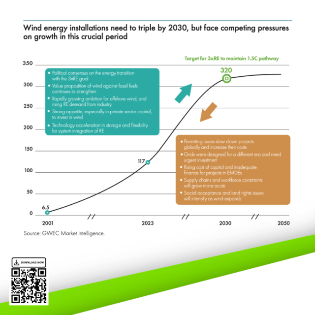 Guardando al futuro, il rapporto chiarisce che c’è molto da fare per realizzare le maggiori ambizioni. L’industria eolica deve quasi triplicare la sua crescita annuale, passando da un livello di 117 GW nel 2023 ad almeno 320 GW entro il 2030, per raggiungere gli obiettivi della COP28 e riportarci sulla rotta di 1,5 gradi.