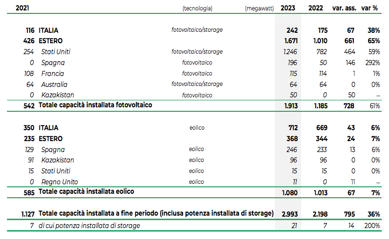 Si conferma e si rafforza la linea di investimento focalizzata sull’estero. L’aumento di nuova capacità infatti, riviene dall’estero per la quasi totalità: 685 MW su 795 (86%: nel 2022 era il 65%) da acquisizioni fatte all’estero e 110 MW da acquisizioni in Italia (14%, contro il 35% dell’anno precedente).