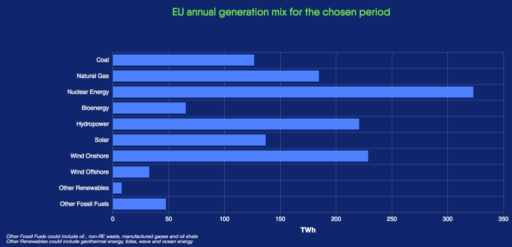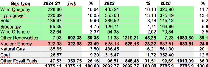 Nel grafico cumulativo dei primi sei mesi, l’associazione mostra come le rinnovabili abbiano prodotto il 51% dell’energia UE (692 TWh), il nucleare il 23% (323) e le fossili il 26% (330). Nell’intero 2023 le tre macrotipologie di fonti sono state rispettivamente il 45% (1.219 TWh), il 23% (625) e il 32% (848). Ancora, nel 2020: 39% (1.089 TWh), 25% (684), 36% (1.013).