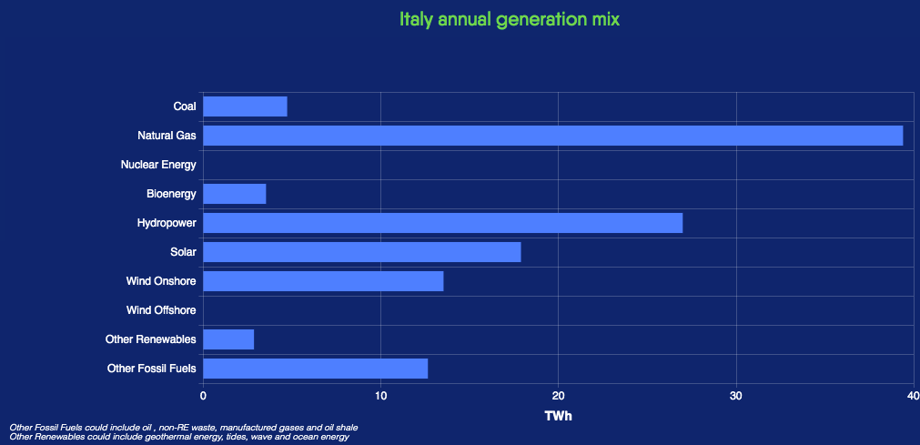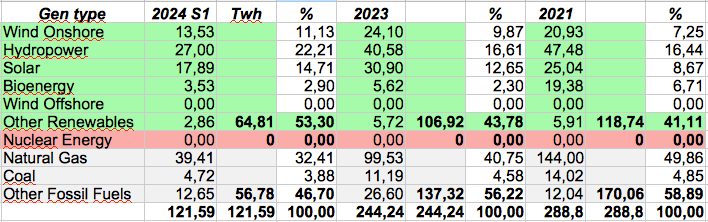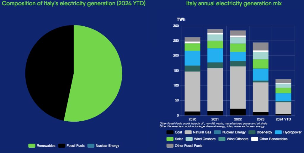 Per quanto riguarda il nostro Paese, le statistiche illustrano una situazione nel primo semestre 2024, in cui la produzione da fonti rinnovabili è oltre il 53% (65 TWh), contraltare di energie fossili che producono circa il 47% (57).