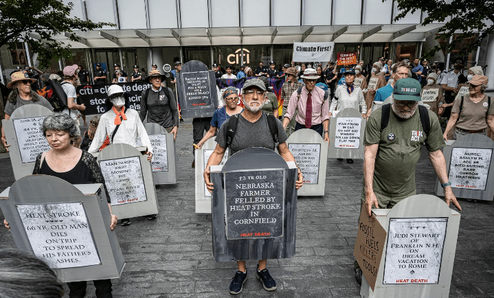 È iniziato con gli elogi funebri: alcuni di noi sono saliti su una scala a pioli e hanno parlato attraverso un piccolo impianto audio alla folla radunata di diverse centinaia di persone, quasi tutte americane anziane organizzate da Third Act. (È la “settimana degli anziani” in questa protesta in corso, Summer of Heat fuori dalla Citibank). C’erano, come ci si aspetterebbe, alcuni membri del clero: Rev. Lennox Yearwood (Church of God in Christ), Rev. Margarett Bullitt-Jonas (Episcopal), Rev. Jim Antal (United Church of Christ). Hanno parlato anche un paio di giovani che hanno organizzato le proteste di quest’estate: Liv Senghor, Keanu Arpels-Josiah, così come Gus Speth, un veterano dei primi giorni del movimento ambientalista e uno dei suoi leader più riflessivi e profondi.