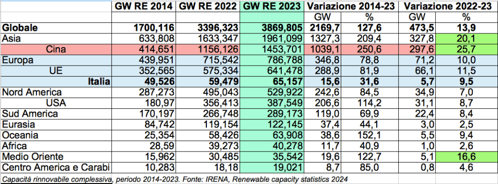 Il Rapporto dell’Agenzia internazionale per l’energia rinnovabile evidenzia come nel corso del 2023 sia stata installata, complessivamente, nuova capacità rinnovabile per 473,5 GW, raggiungendo quasi 3,9 TW in tutto il mondo. L’aumento è stato del 13,9% rispetto al precedente anno. Ma a fronte di questi numeri, c’è da sottolineare come poco meno dei due terzi (il 62,8%) arrivano dalla Cina, che ha aggiunto 297,6 GW al tasso di crescita di quasi il 26%. Notevole anche il quasi 17% nell’anno del Medio Oriente, unica altra regione dopo l’Asia a stare sopra il tasso di crescita.