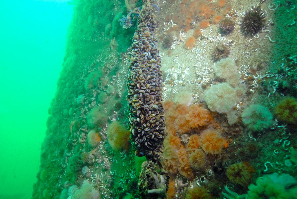 Cozze, alghe, doradi, spigole, pesci esca e molto altro circondano la struttura o si stabiliscono direttamente su di essa. I fori nella turbina per rilasciare la pressione e consentire all’acqua di fluire e rifluire hanno anche portato la vita marina a passare attraverso o risiedere al suo interno.