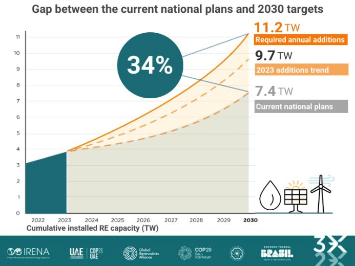 Per soddisfare gli obiettivi globali, la capacità rinnovabile installata dovrebbe crescere da 3,9 terawatt (TW) attuali a 11,2 TW entro il 2030, il che richiederebbe altri 7,3 TW in meno di sei anni. Tuttavia, si prevede che gli attuali piani nazionali lasceranno un divario collettivo globale di 3,8 TW entro il 2030, mancando l’obiettivo del 34%.