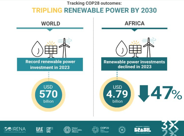 Le economie emergenti e in via di sviluppo continuano ad affrontare lacune di finanziamento che compromettono l’accesso alle tecnologie di transizione energetica ad alta intensità di capitale. Gli investimenti in energia rinnovabile in Africa sono diminuiti del 47% tra il 2022 e il 2023.