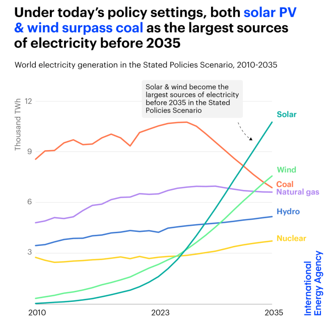 Con il consumo globale di elettricità destinato a crescere fortemente, è importante soddisfare la domanda crescente con fonti pulite di generazione di energia. Sulla base delle attuali impostazioni politiche e delle tendenze di mercato, il solare fotovoltaico e l’eolico sono destinati a diventare le due principali fonti di elettricità prima del 2035, integrando altre fonti pulite come l’idroelettrico e il nucleare e spingendo il carbone, l’attuale principale fonte di elettricità, verso il declino.