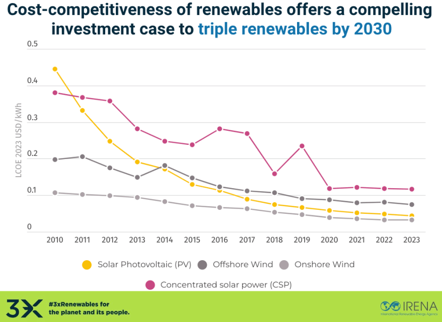 Ciò offre ai paesi un caso di business e di investimento convincente per triplicare le energie rinnovabili entro il 2030. La generazione di energia rinnovabile è diventata la fonte predefinita di nuova generazione di energia a minor costo.