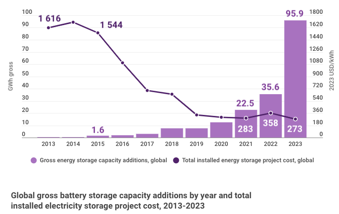 I costi dei progetti di accumulo sono diminuiti dell’89% tra il 2010 e il 2023, facilitando l’integrazione di quote elevate di capacità solare ed eolica e contribuendo ad affrontare le sfide infrastrutturali della rete.