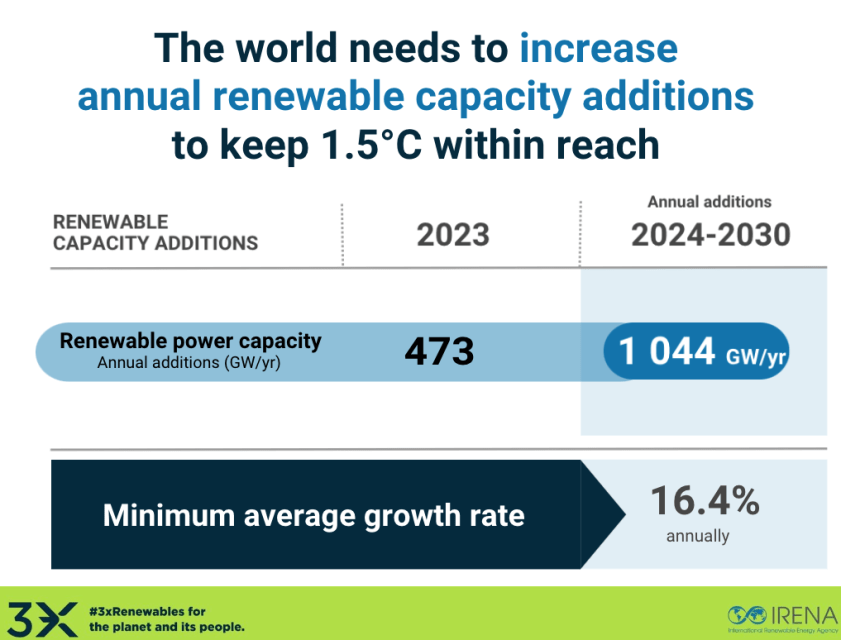 Tuttavia, i progressi non sono sufficienti per triplicare le energie rinnovabili entro il 2030. È necessaria una crescita minima del 16,2% annuo per raggiungere l’obiettivo di triplicazione entro il 2030.