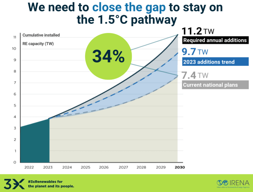 Secondo l’Agenzia internazionale per le energie rinnovabili (IRENA), in molti modi sono stati fatti progressi. Il 2024 è stato contrassegnato come l’anno dei record per le energie rinnovabili, con aumenti record nella capacità energetica, nei posti di lavoro e negli investimenti nelle energie rinnovabili, mentre i costi dell’energia hanno subito un calo spettacolare. Ma i progressi verso 3xRenewables, cioè di triplicare le energie rinnovabili installate entro il 2030, sono ancora carenti. Il mondo deve intensificare le collaborazioni internazionali per garantire che i fondi siano indirizzati equamente agli sforzi di transizione energetica e per implementare progetti di energia rinnovabile su larga scala.