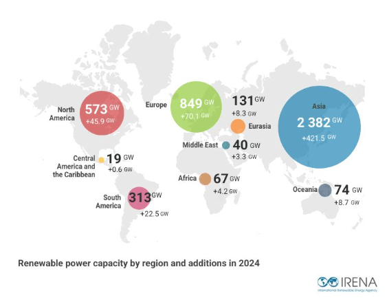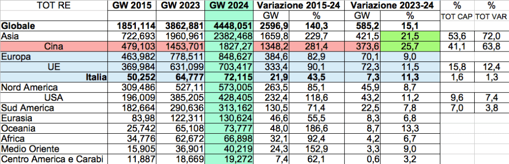 Abbiamo elaborato un quadro di sintesi per macroregioni, dai dati del Renewable capacity statistics 2025 di IRENA, così come segue: