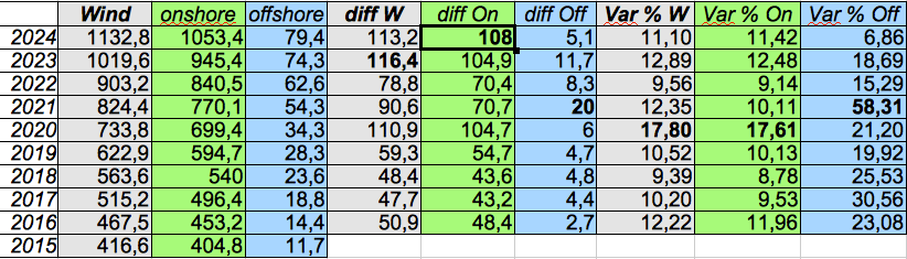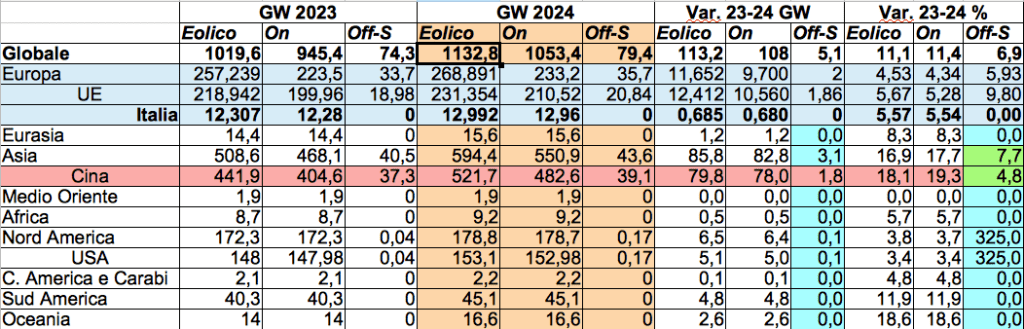 Il 2024, invece, è stato anno record per l’eolico a terra (onshore), con 108 GW installati in tutto il mondo, con oltre l’11% di incremento sull’anno precedente (meglio era stato solo l’incremento percentuale del 2020: quasi 18%).
