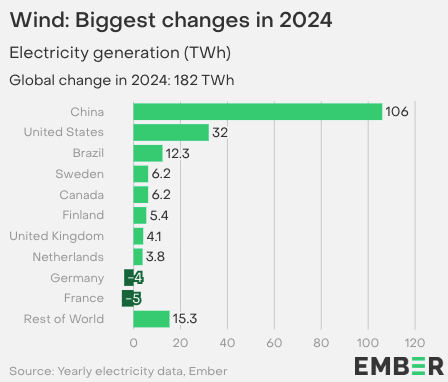 La Cina ha rappresentato ben oltre il 50% dell’aumento globale dell’energia eolica nel 2024, con una produzione eolica in aumento di 106 TWh (+12%). L’aumento della produzione eolica in Cina nel 2024 è stato più di tre volte superiore a quello degli Stati Uniti, che hanno registrato il secondo maggiore incremento.