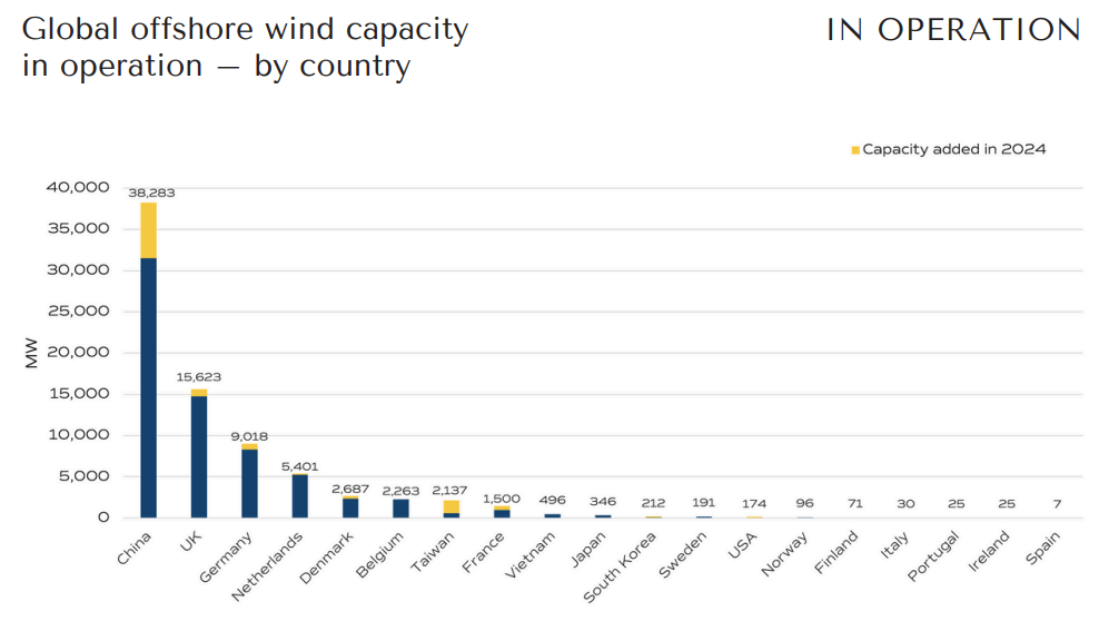 La Cina continua a guidare il settore, con ben 38 GW di capacità installata, riaffermando il suo impegno verso le energie rinnovabili. Anche altri Paesi stanno incrementando le loro capacità eoliche offshore, segnalando un più ampio spostamento verso portafogli energetici diversificati e resilienti. Inoltre, l’eolico galleggiante sta guadagnando slancio: la Francia ha messo in funzione il suo primo parco eolico offshore galleggiante, Provence Grand Large (25 MW).