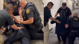 Immagine: The Crucial Years – Il senatore californiano Alex Padilla immobilizzato a terra e ammanettato dagli agenti federali per il reato di aver fatto domande durante una conferenza stampa.