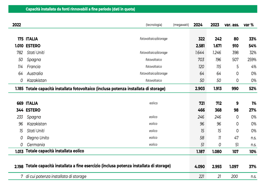 Si conferma e si rafforza la linea di investimento focalizzata sull’estero. L’aumento di nuova capacità, infatti, riviene dall’estero per il 92% (1.008 MW su 1097) aumentando persino rispetto all’86% del 2023; in Italia soli 89 MW aggiuntivi, pari all’8%, contro il 14% dell’anno precedente.