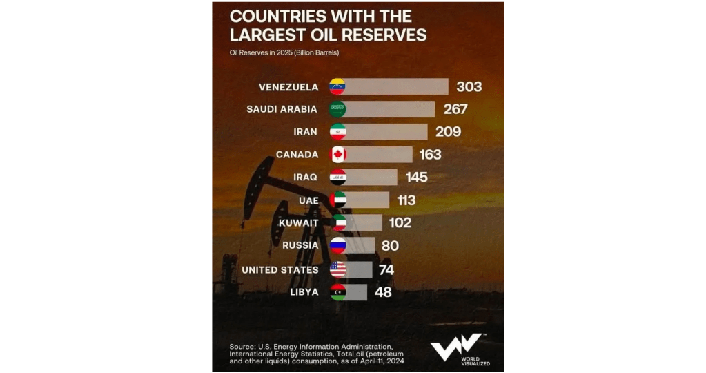 Ma il grafico in cima a questo breve saggio è certamente suggestivo. Questi sono i paesi al mondo con le maggiori riserve di petrolio, e sono quasi senza eccezioni gli stessi luoghi in cui siamo stati coinvolti in infiniti combattimenti o, nel caso del Canada, in infinite minacce. (La Groenlandia, tra l’altro, possiede anch’essa ingenti riserve di petrolio; le ha rese inaccessibili nel 2021, vietando l’esplorazione petrolifera per motivi legati al cambiamento climatico). Probabilmente non ci preoccupiamo molto delle violazioni dei diritti umani in Venezuela, perché i diritti umani non sono attualmente in cima (o in fondo) alle preoccupazioni del nostro Dipartimento di Stato (tranne che per i sudafricani bianchi). Ma quasi certamente ci sta a cuore quel petrolio. In effetti, non è esattamente nascosto: ecco cosa ha detto Trump a metà dicembre.