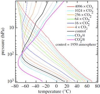 Le altre curve in Fig. 10.2 sono calcolate per successivi raddoppi di CO2 atmosferica. Ogni raddoppio di CO2 è un “forzante” equivalente a un aumento del 2% dell’irradianza solare, come discusso nei capitoli successivi. Il nostro Sole è una stella ordinaria, che “brucia” idrogeno tramite fusione nucleare, con un’irradianza solare che aumenta del 10% ogni miliardo di anni, equivalente a 5 raddoppi di CO2 (32×CO2 ) in 1 miliardo di anni. L’aumento del 20% dell’irradianza solare in due miliardi di anni produce un forzante climatico equivalente a 1024×CO2.