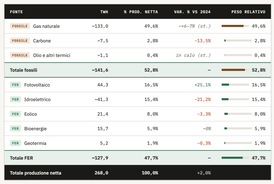 Complessivamente, l’Italia è ancora un Paese a gas (49,6%): di seguito una tabella di riepilogo dei 268 TWh prodotti per fonte.