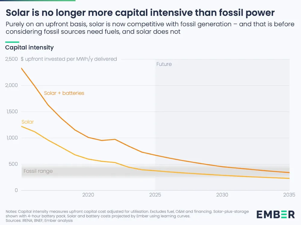 Ecco un grafico interessante, realizzato dal think tank Ember. Richiede qualche spiegazione. La vecchia narrazione sull’energia pulita – ovvero, la narrazione degli ultimi cinque anni – è che fosse più economica da gestire rispetto ai combustibili fossili, perché il combustibile (il sole) era gratuito, ma che i costi iniziali fossero più elevati perché era necessario installare i pannelli solari. Ora, però, la costruzione dei pannelli solari è talmente economica che il passaggio all’energia pulita diventa conveniente fin da subito. La fascia grigia in basso rappresenta il costo del sistema a combustibili fossili, mentre la linea arancione rappresenta il solare con batterie, che fornisce la stessa energia affidabile. Ripeto, questo è il costo iniziale: a lungo termine, ovviamente, il sistema solare è enormemente più economico, perché, ancora una volta, il sole fornisce energia gratuitamente quando sorge sopra l’orizzonte.