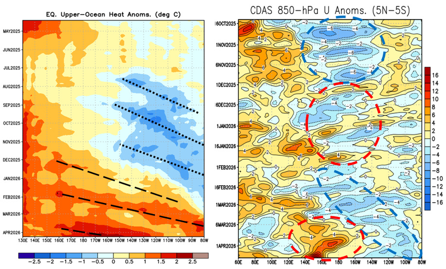Tuttavia, nella prima settimana di aprile, l’anomalia a 300 m raggiunge +1,6°C (Fig. 3). Questo aumento dell’anomalia termica è il risultato dell’onda di Kelvin di rinforzo (Fig. 4, a sinistra) che si sposta da ovest a est (vedi la discussione nel nostro precedente post su El Niño[4]). Quest’onda di Kelvin è stata amplificata dalle recenti anomalie dei venti occidentali (Fig. 4, a destra).