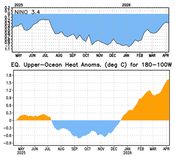 [8] Il NOAA Climate Prediction Center aggiorna le informazioni su El Niño ogni settimana, normalmente il lunedì. Le figure 3 e 4 qui riportate sono state copiate dal loro post del 13 aprile 2026. Il rapporto di sintesi del NOAA del 9 aprile 2026 rileva che le figure 3 e 4 utilizzano il nuovo periodo di riferimento 1991-2020. Le figure 1 e 2 nella nostra comunicazione attuale utilizzano il periodo di riferimento 1981-2010. Uno dei vantaggi dell’utilizzo dei primi 300 m per caratterizzare lo stato di Niño è che i primi 300 m sono meno influenzati dal riscaldamento di origine antropica rispetto a Niño3.4. In un post o articolo futuro, affronteremo la questione di come minimizzare l’effetto del riscaldamento a lungo termine nelle valutazioni dello stato di Niño.